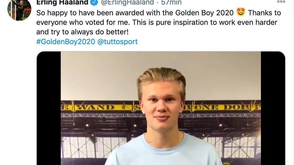 TORINO - Erling Haaland ha vinto il Golden Boy 2020 e sarà premiato a Torino il 14 dicembre dal nostro giornale. Il norvegese con un breve video pubblicato su Twitter ringrazia Tuttoport. Con un sorriso grande così, anche perché ha appena segnato 4 gol col Borussia Dortmund all'Herta Berlino. Modo migliore per festeggiare la notizia non poteva esserci.